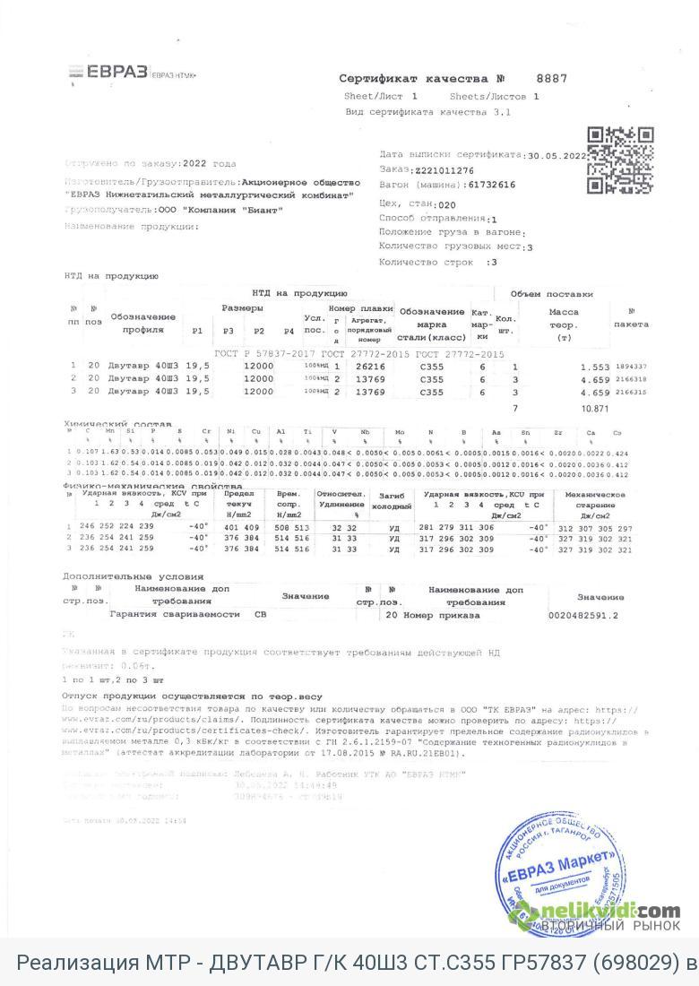 Реализация МТР - ДВУТАВР Г/К 40Ш3 СТ.С355 ГР57837 (698029) в количестве 0,919тн (сертификаты в приложение). Размеры 1шт. - 7,1 м.