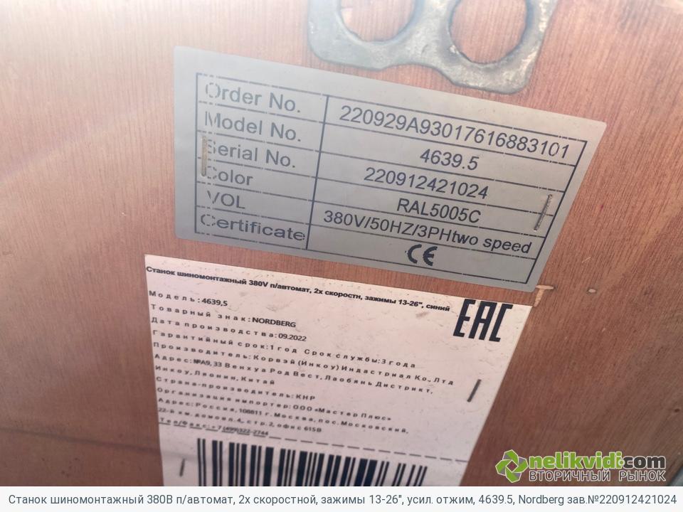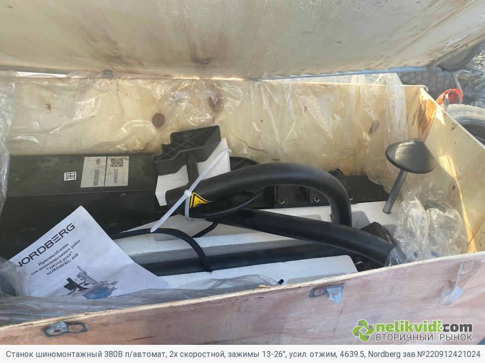 Станок шиномонтажный 380В п/автомат, 2х скоростной, зажимы 13-26", усил. отжим, 4639.5, Nordberg зав.№220912421024. Станок находится в заводской упаковке, не монтировался, не эксплуатировался