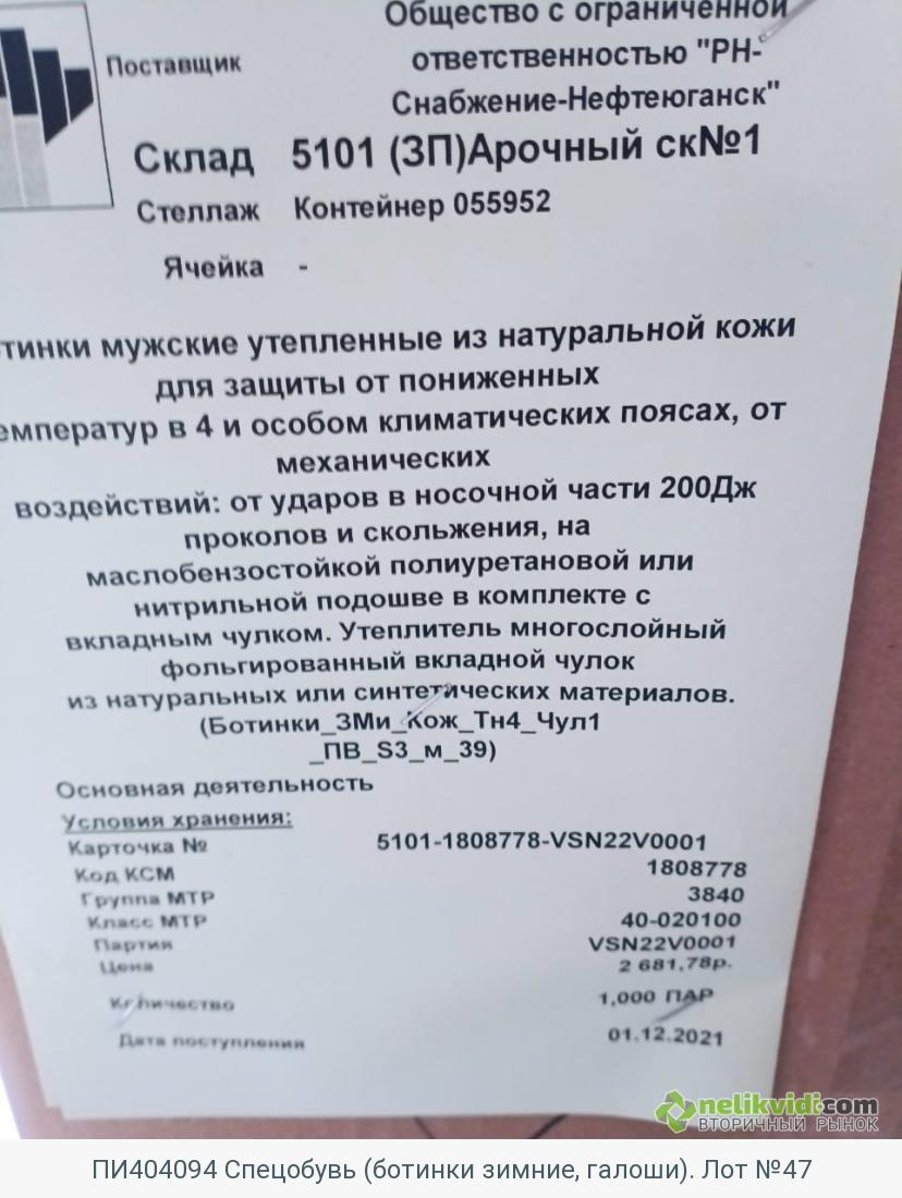 ПИ404094 Спецобувь (ботинки зимние, галоши). Лот №47. № п/п Наименование МТР БЕИ Кол-во Дата приобретения Техническое состояние