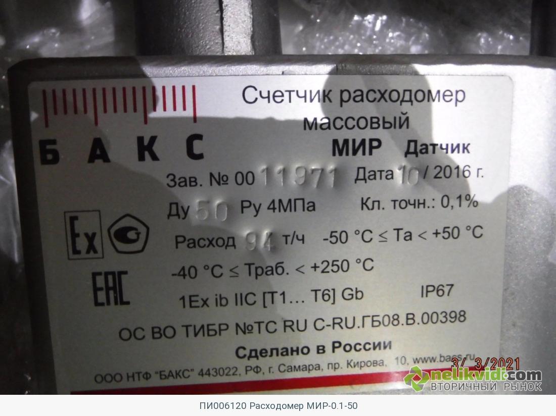 ПИ006120 Расходомер МИР-0.1-50. Расходомер МИР-0.1-50 1 шт Дата изготовления: 10.2016 г. 318 800 руб, с НДС