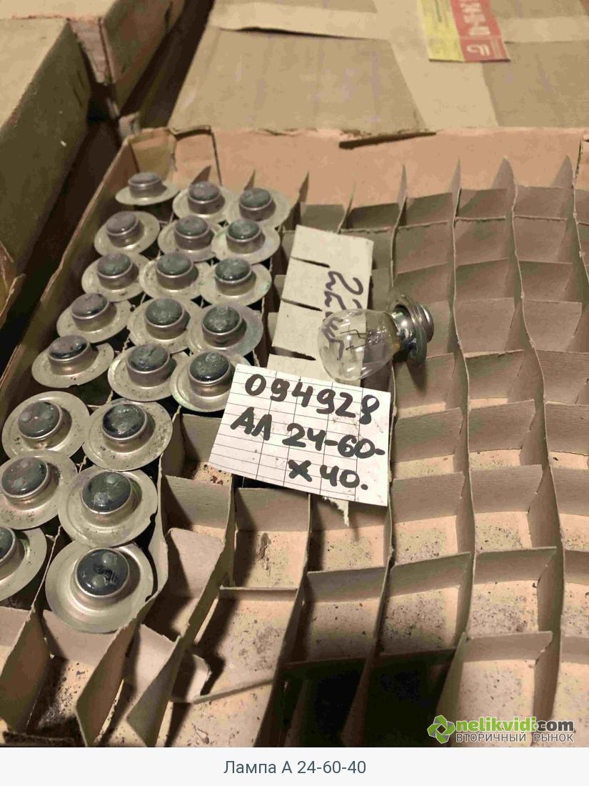 Лампа А 24-60-40. Группа материала: Электроустановочные изделия и лампы. Подгруппа материала: Электрооборудование, приборы автомобилей и тракторов. Технические характеристики: U=24В, P=60Вт. Коэффициент тех. состояния: 0,7. Склад: 0004. Обозначение склада: ЦМТО_СКЛ_4. Город: Мончегорск