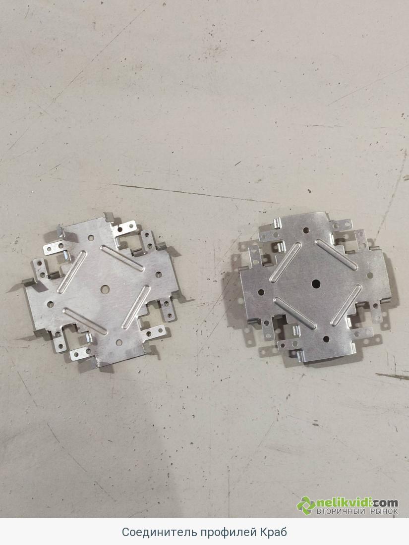 Соединитель профилей Краб. Группа материала: Прочие МТР. Подгруппа материала: Общестроительные материалы. Технические характеристики: Одноуровневый, из оцинкованной стали, 148х56х20мм, для крестообразного соединения профилей потолочных ПП60х27 при монтаже каркаса для облицовки ГКЛ. ГОСТ, ТУ\ Каталожный номер: ТУ 1121-004-04001508-2003. Завод-изготовитель: Knauf, ГЕРМАНИЯ. Коэффициент тех. состояния: 0,8. Город: Мончегорск. Склад: 0004