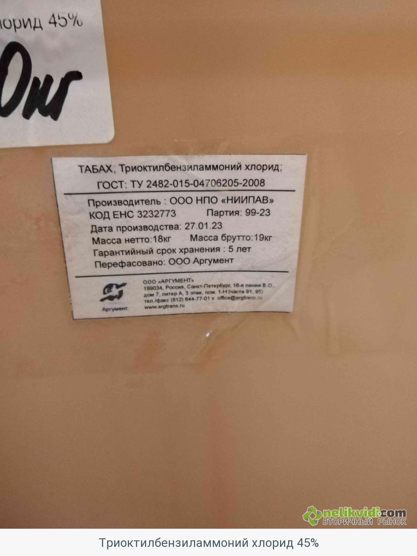 Триоктилбензиламмоний хлорид 45%. Группа материала: ЛКМ, сух.смеси и хим.материалы. Технические характеристики: массовая доля основного вещества 45%, массовая доля свободных аминов не более 5%, вязкая жидкость коричневого цвета. ГОСТ, ТУ, Каталожный номер: ТУ 2482-015-04706205-2008. Коэффициент тех. состояния: 1. Склад: 0004. Обозначение склада: ЦМТО_СКЛ_10. Город: Мончегорск