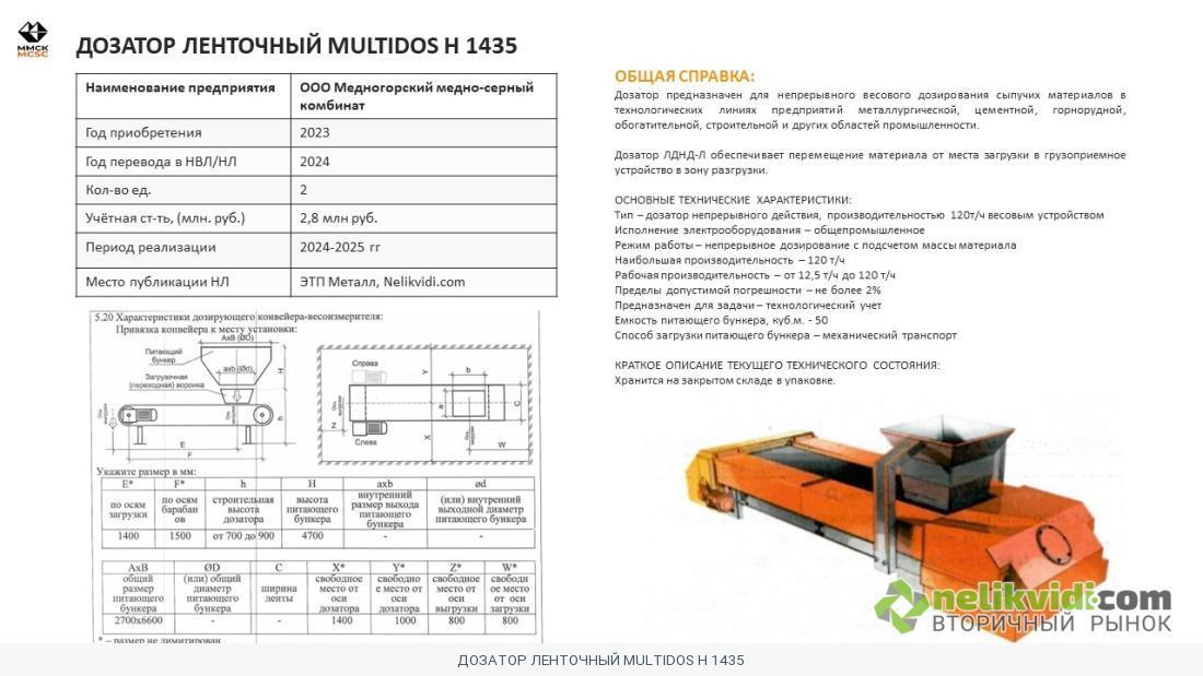 ДОЗАТОР ЛЕНТОЧНЫЙ MULTIDOS H 1435. Тип – дозатор непрерывного действия, производительностью 120т/ч весовым устройством