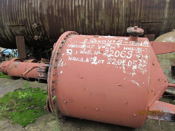 АППАРАТ н/ж, б/у-2м3. Аппарат н/ж с разъёмной крышкой с коническим днищем, с приводом-мешалкой, на опорах-стойках. Диаметр-1400мм. Высота корпуса-2200мм. Высота с приводом-3700мм. Масса-2000кг. Рраб.- атмосферное.