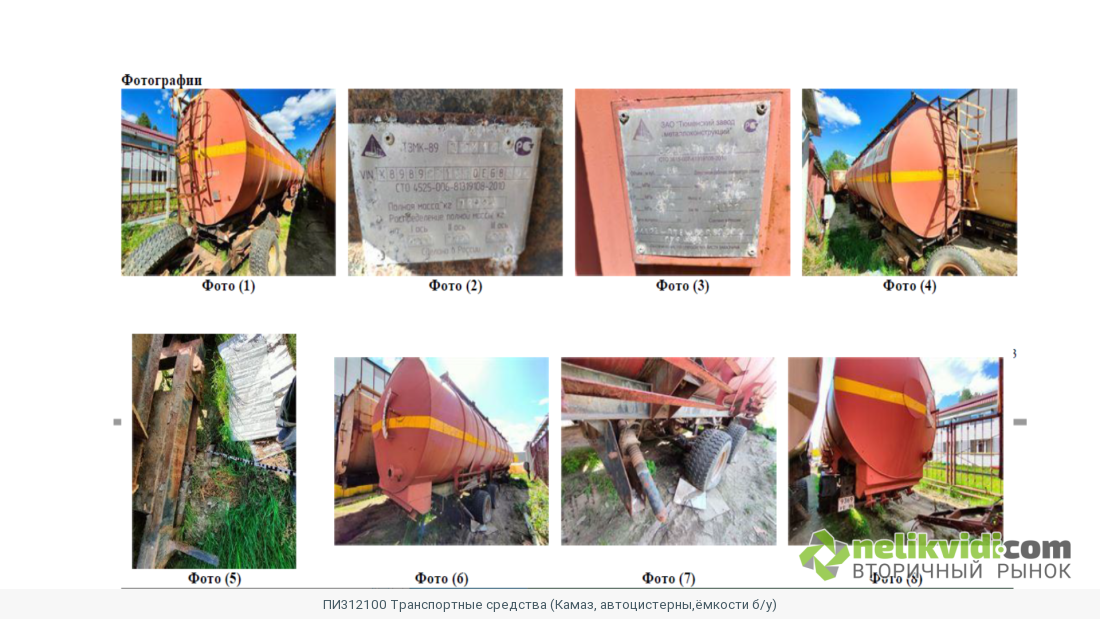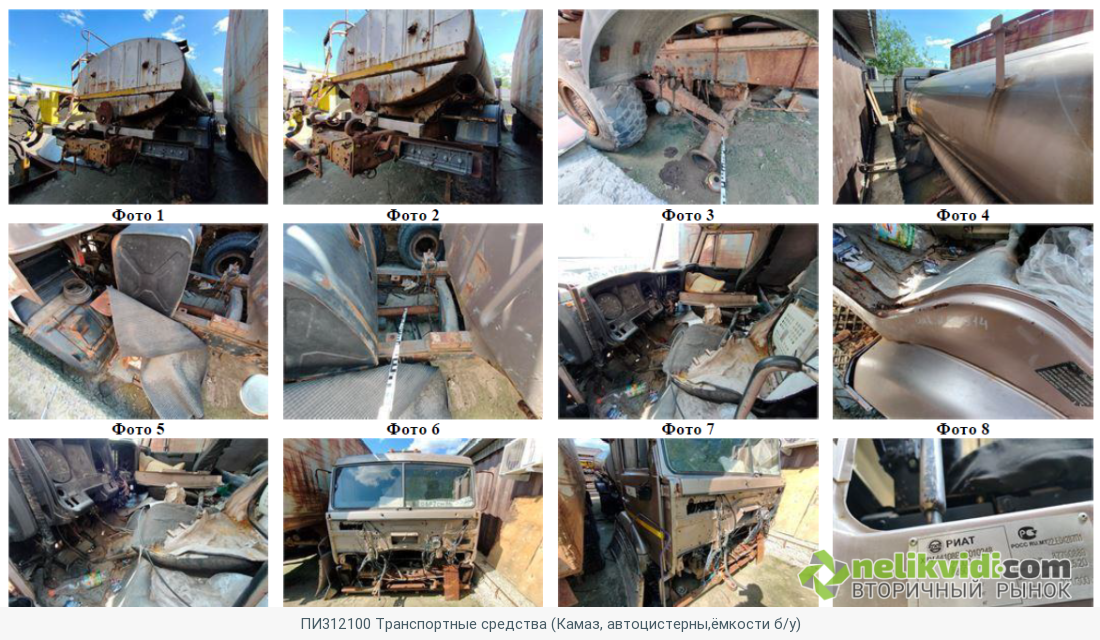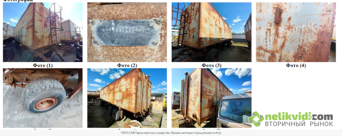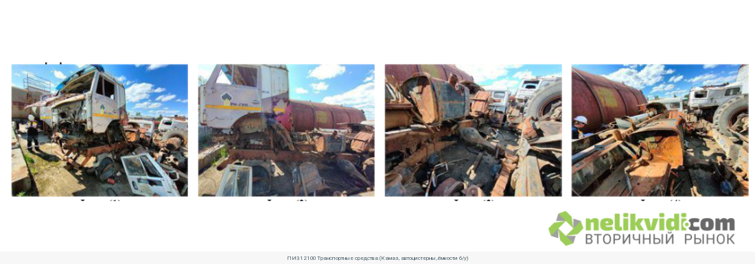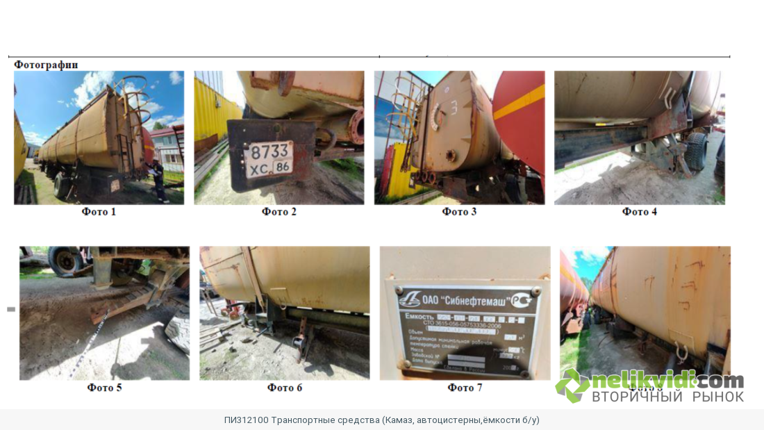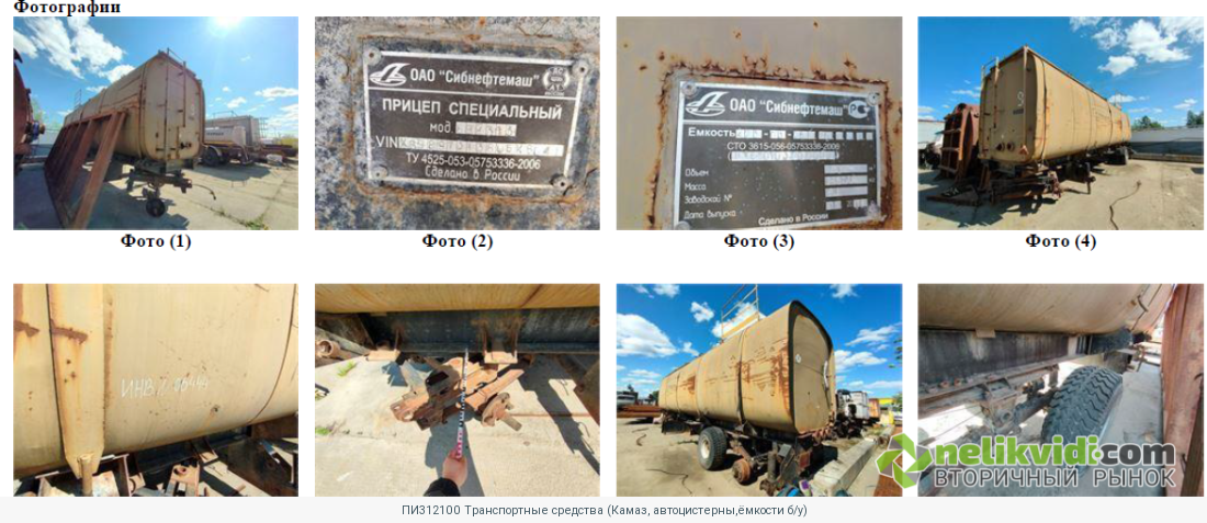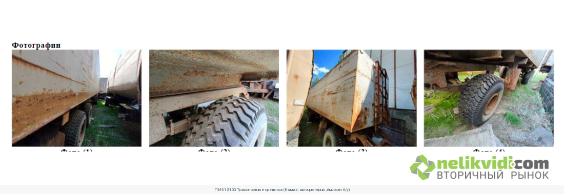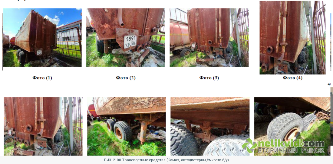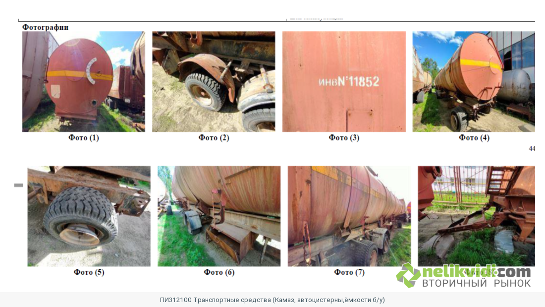 Лот 12 Емкость ЕТМ-60 м3 на шасси , VIN XSC847010E1017433 Коррозия наружного металлического покрытия транспортного средства составляет 90%, общий износ 80%. Множественные трещины рамы и поворотного круга, износ балансиров, автошин 80%. Восстановление ТС нецелесообразно Неисправен указатель уровня жидкости, зедвижки неисправны, тормозные камеры неисправны, тормозные рычаги неисправны, электропроводка отсутствует, задний фонарь отсутствует, розетка на подключение к тягачу отсутствует. Негодное 2015 г.в.