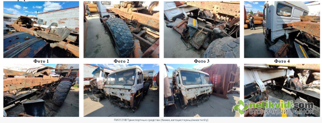 ПИ312100 Транспортные средства (Камаз, автоцистерны,ёмкости б/у). Лот 1 Камаз 43118-10 седельный тягач VIN X8V43118К70001085 (уст "Автоскан-GPS" ин № 04136) Внешние повреждения 70-80%, Коррозия наружнего покрытия 90%. Восстановление ТС нецелесообразно Отстутствуют ветровое стекло, стекло левой двери, форточки, стеклоомыватели и чтеклоочистители, зеркала заднего вида, обивка передних дверей, стеклоподъемник левой двери,замки и ручки дверей, приборная панель, сидения, отопитель кабины, подножки, ДВС, сцепление, коробкая передач, раздаточная коробка, карданные валы, мосты и т.д. Негодное 2007 г.в.