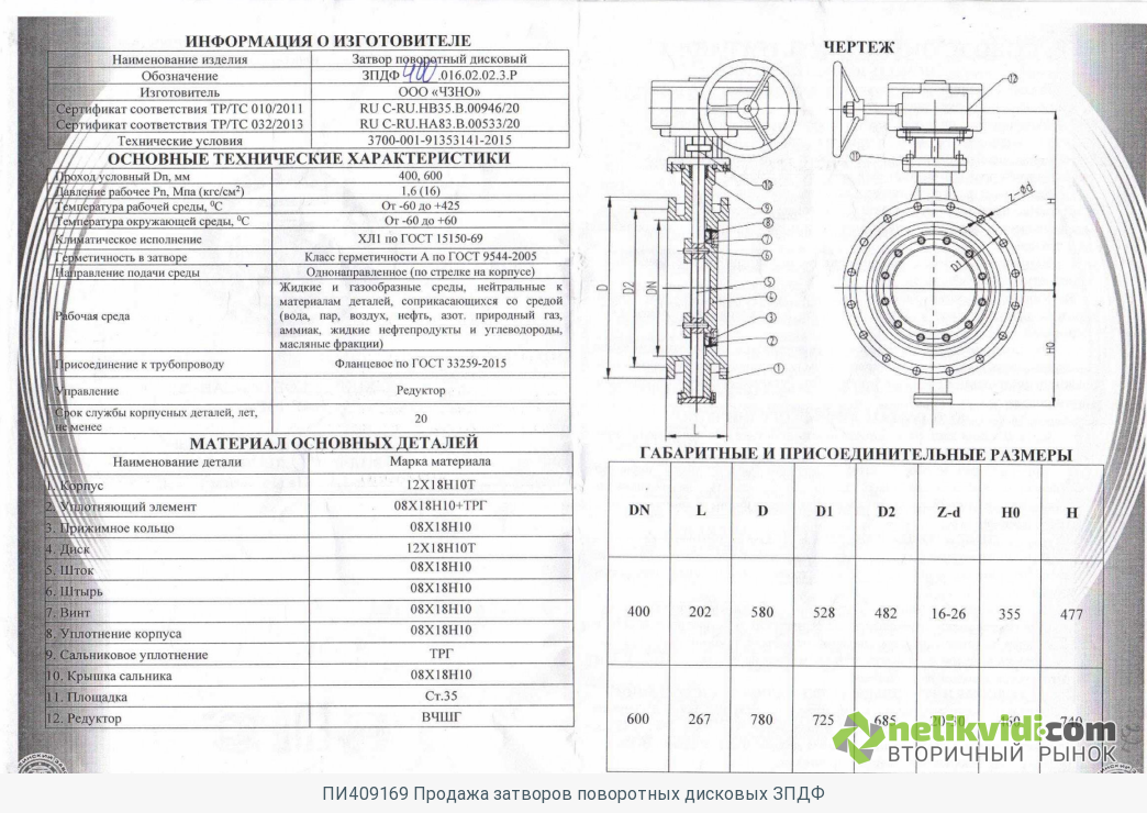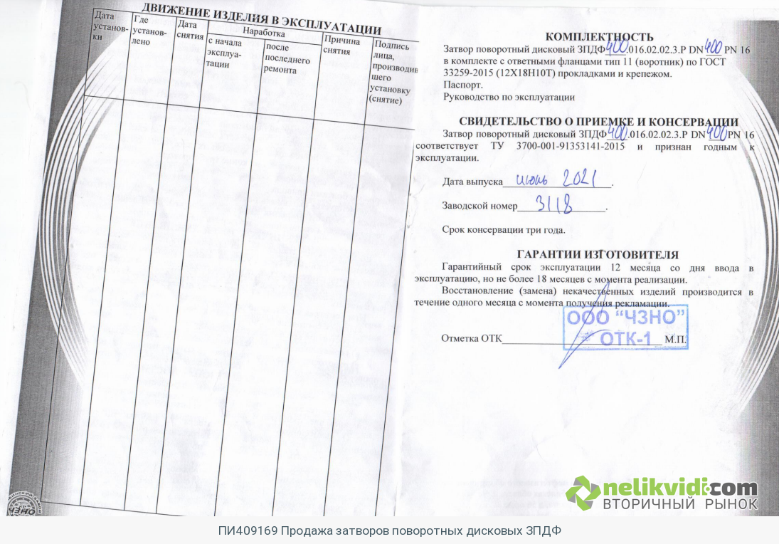 ПИ409169 Продажа затворов поворотных дисковых ЗПДФ. Описание имущества