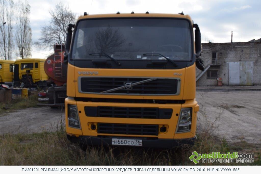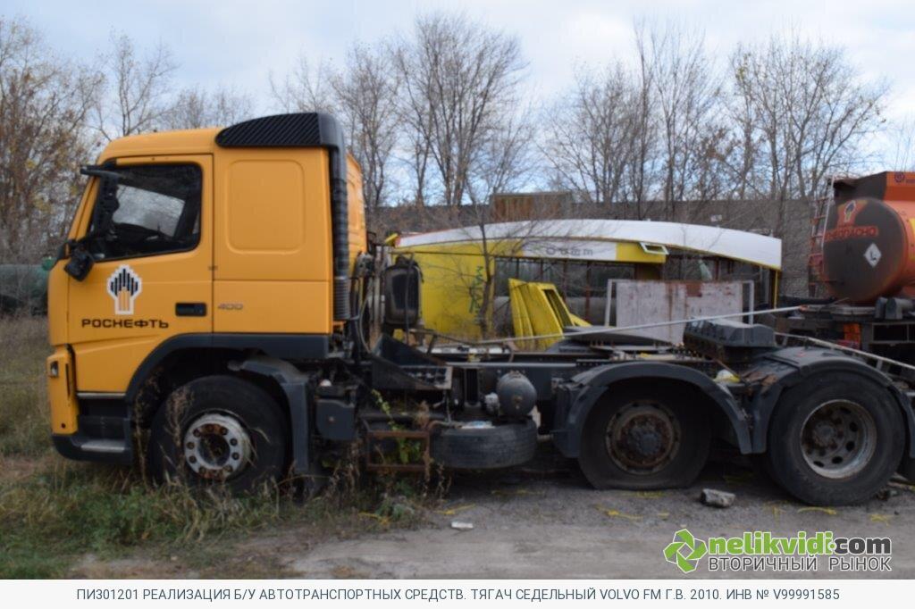 ПИ301201 РЕАЛИЗАЦИЯ Б/У АВТОТРАНСПОРТНЫХ СРЕДСТВ. ТЯГАЧ СЕДЕЛЬНЫЙ VOLVO FM Г.В. 2010. ИНВ № V99991585. Тягач седельный VOLVO FM Г.в. 2010. Инв № V99991585 Транспортное средство технически неисправно. Двигатель не запускается, течь масла через сальники и уплотнители, требует замены распредвалов и шатунных вкладышей. МККП имеет сильный износ, передачи не включаются, течь масла через сальники. АКБ не исправно, разрушения и осыпания пластин. Шины имеют предельный износ протектора. Топливный бак не герметичен. Электропроводка замкнута, частично отсутствует. Рама имеет сольную коррозию. Редукторы ведущих мостов имеют предельный износ шестерён и валов, течь масла через сальники.