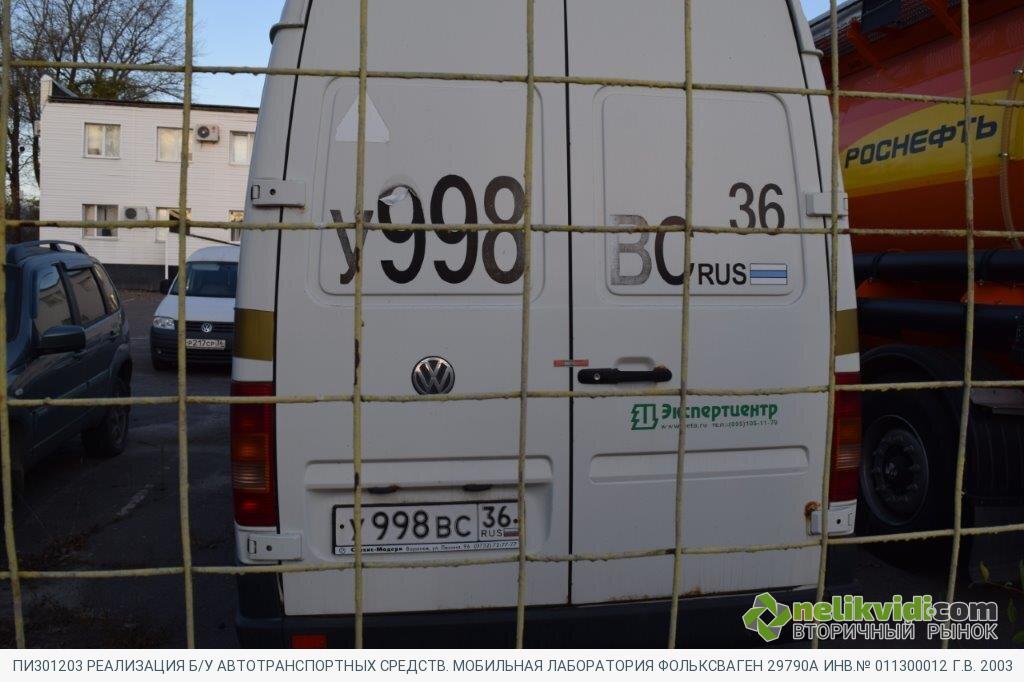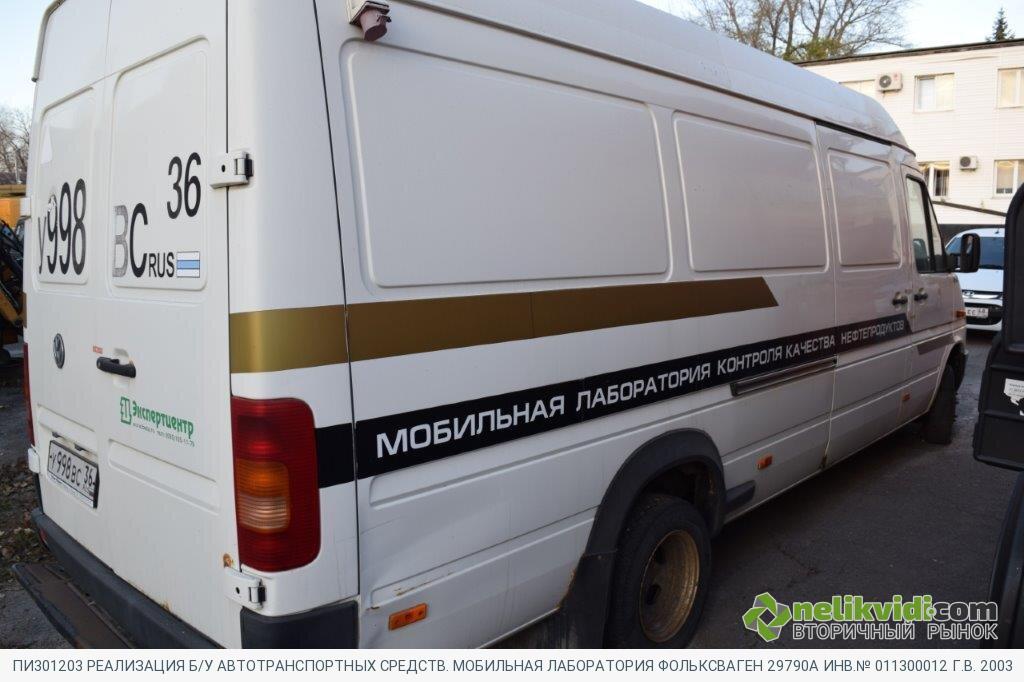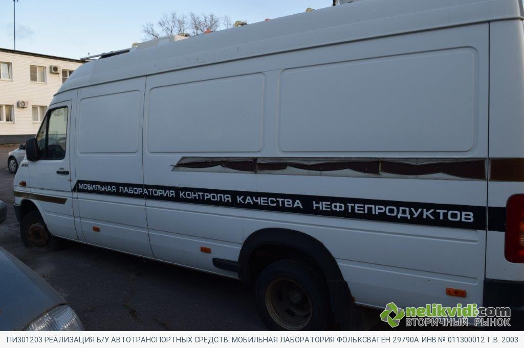 ПИ301203 РЕАЛИЗАЦИЯ Б/У АВТОТРАНСПОРТНЫХ СРЕДСТВ. МОБИЛЬНАЯ ЛАБОРАТОРИЯ ФОЛЬКСВАГЕН 29790А ИНВ.№ 011300012 Г.В. 2003. Мобильная лаборатория Фольксваген 29790А инв.№ 011300012 г.в. 2003/Кузов в результате коррозии имеет множественные сквозные отверствия, требуются сварочные и покрасочные работы. Сиденья салона требуют замены. Двигатель требует капитального ремонта, стуки в райне коленвала. Система охлаждения не герметична, необходима замена патрубков. Необходим текущий ремонт ходовой. Требуется ремонт топливной аппаратуры. Требуется замена аккумуляторной батареи. Требуется замена тормозных колодок. Автошины требуют замены. Требуется ремонт электропроводки. Требуется текущий ремонт КПП. Редуктор заднего моста требует капитального ремонта. Требуется замена лобового стекла. Требуется замена блоков передних фар. Все уплотнения и резинотехнические изделия требуют замены. Автомобиль не эксплуатируется с 2018г. Оборудование лаборатории не пригодно к дальнейшему использованию по назначению.