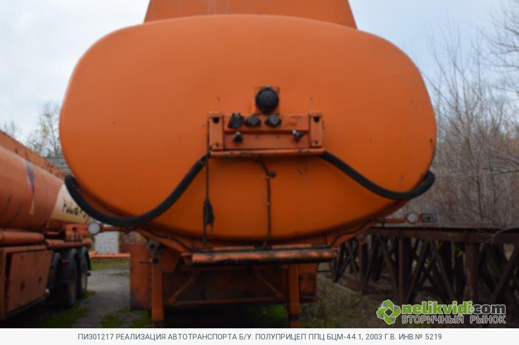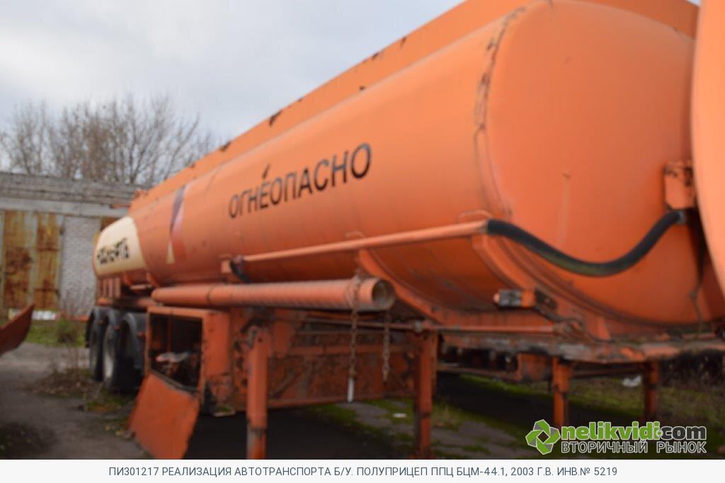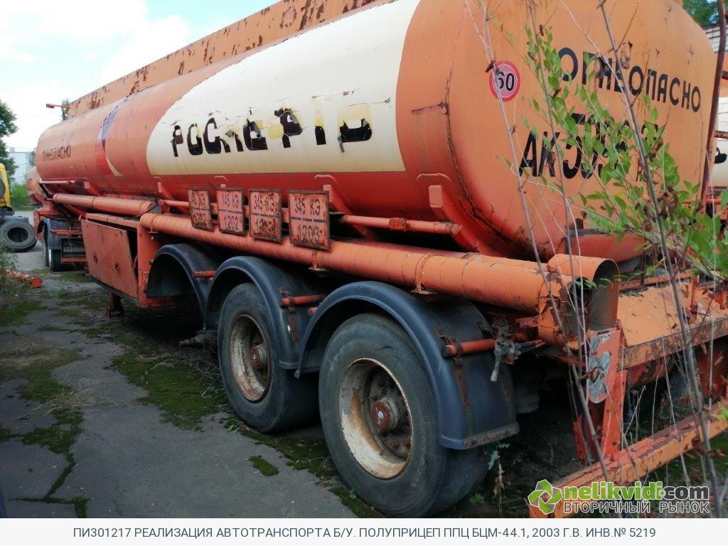 ПИ301217 РЕАЛИЗАЦИЯ АВТОТРАНСПОРТА Б/У. ПОЛУПРИЦЕП ППЦ БЦМ-44.1, 2003 Г.В. ИНВ.№ 5219. Полуприцеп ППЦ БЦМ-44.1, 2003 г.в. Инв.№ 5219 / Полуприцеп-цистерна технически неисправна. Ёмкость цистерны имеет внешнюю коррозию, требует полной покраски. Электропроводка замкнута, нарушен изолирующий слой. Внутренние перегородки отсеков имеют трещины, отсеки не герметичны. Заливные люки горловин не исправны, запорные устройства отсутствуют. Шины имеют предельный износ протектора. Оси требуют ремонта, с заменой сайлентблоков, тормозных дисков, подшипников, АБС не работает