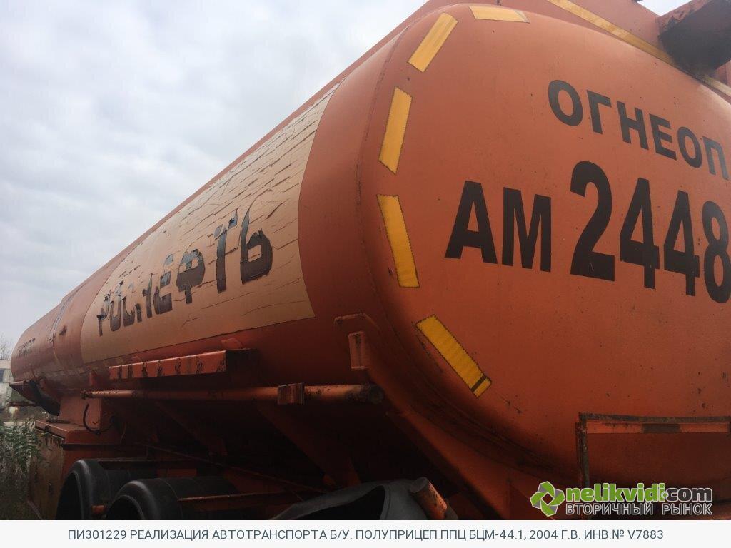 ПИ301229 РЕАЛИЗАЦИЯ АВТОТРАНСПОРТА Б/У. ПОЛУПРИЦЕП ППЦ БЦМ-44.1, 2004 Г.В. ИНВ.№ V7883. Полуприцеп ППЦ БЦМ-44.1, 2004 г.в. Инв.№ V7883/ Полуприцеп-цистерна технически неисправна. Ёмкость цистерны имеет внешнюю коррозию, требует полной покраски. Электропроводка замкнута, нарушен изолирующий слой. Внутренние перегородки отсеков имеют трещины, отсеки не герметичны. Заливные люки горловин не исправны, запорные устройства отсутствуют. Шины имеют предельный износ протектора. Оси требуют ремонта, с заменой сайлентблоков, тормозных дисков, подшипников, АБС не работает