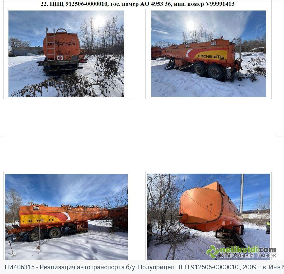Продается Полуприцеп ППЦ 912506-0000010, 2009 г.в. Инв.№ V99991413, б/у, б/у ППЦ неисправна. Требует полной покраски. Автошины требуют замены, имеют предельный износ. Электропроводка замкнута, частично отсутствует. Перегородки секций прогнили и деформированы. Люки горловин секций не исправны, требуют замены. Донные клапаны неисправны и не герметичны. Запорная и сливная аппаратура неисправна, частично отсутствует. Ходовая часть требует ремонта и имеет предельный износ. Технологические отсеки имеют сквозную коррозию. Леерное ограждение и лестница подъема на верх цистерны не исправны, не обеспечивают безопасность и требуют замены. Диски колёс деформированы, требуют замены. ППЦ не эксплуатируется с 2017 года. Находится на открытой площадке.
