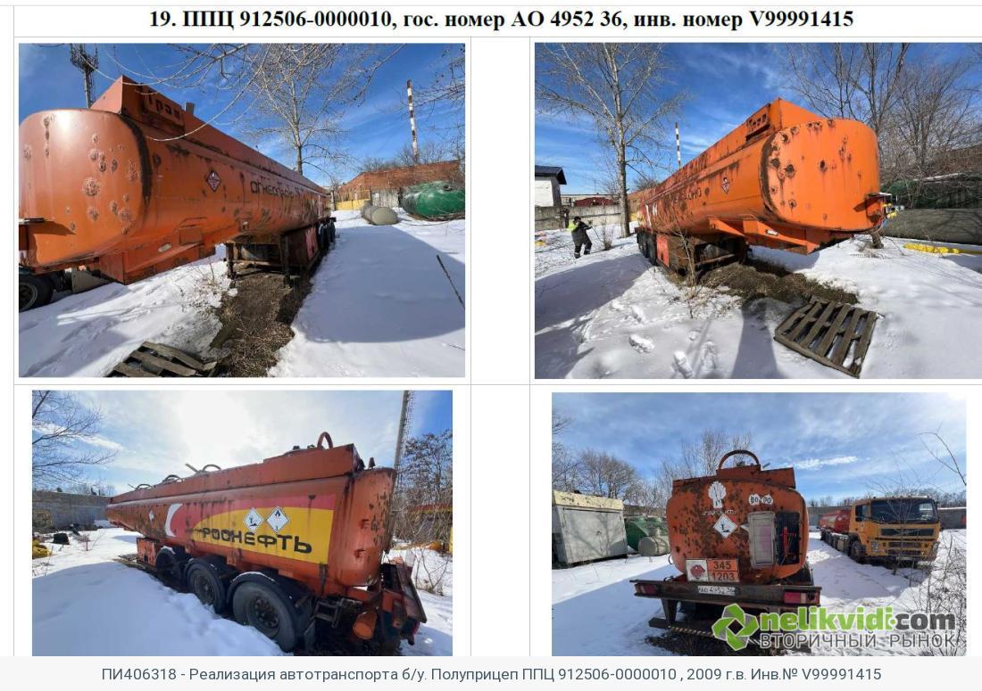 Продается Полуприцеп ППЦ 912506-000001, 2009 г.в. Инв.№ V99991415, б/у, б/у ППЦ неисправна. Требует полной покраски. Автошины требуют замены, имеют предельный износ. Электропроводка замкнута, частично отсутствует. Перегородки секций прогнили и деформированы. Люки горловин секций не исправны, требуют замены. Донные клапаны неисправны и не герметичны. Запорная и сливная аппаратура неисправна, частично отсутствует. Ходовая часть требует ремонта и имеет предельный износ. Технологические отсеки имеют сквозную коррозию. Леерное ограждение и лестница подъема на верх цистерны не исправны, не обеспечивают безопасность и требуют замены. Диски колёс деформированы, требуют замены. ППЦ не эксплуатируется с 2017 года. Находится на открытой площадке.